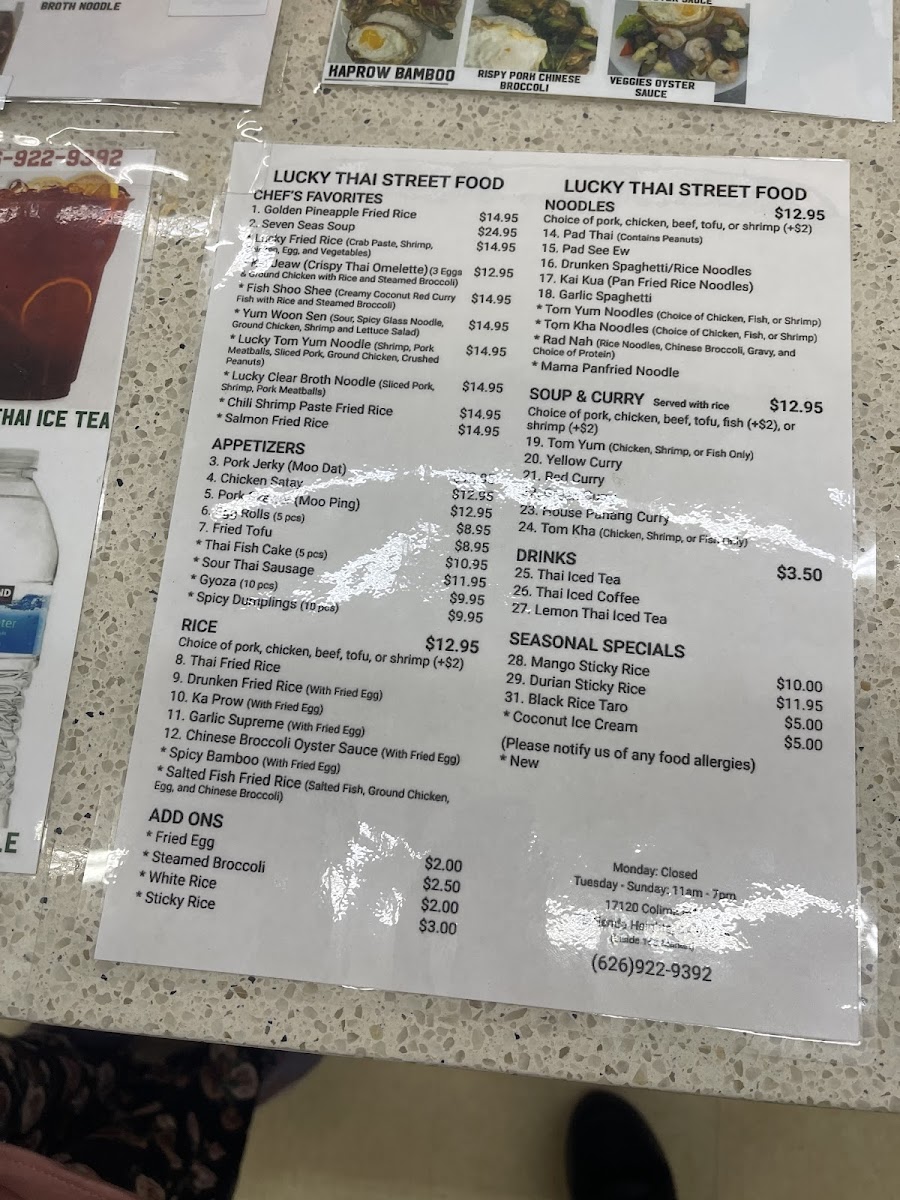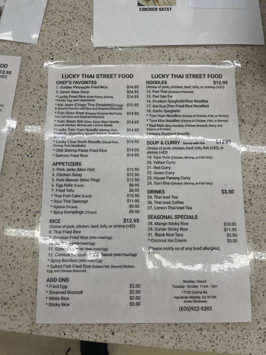 If you’re craving bold flavors and vibrant dishes, the Lucky Thai Street Food Menu is your next go-to adventure. Right from the first page, you’ll notice a playful mix of traditional Thai favorites and creative street-style twists that make every bite exciting. Think zesty pad thai with just the right kick, fresh spring rolls bursting with crisp veggies, and aromatic curries that balance spice and sweetness perfectly. What’s really fun is how each section of the menu flows-you can hop from sizzling noodles to savory satay skewers without missing a beat, and the dessert and drink options add a refreshing finish that keeps you coming back. The menu doesn’t just list dishes; it tells a story of flavors that are approachable yet full of personality, making it easy to mix, match, and discover something new with every visit. Whether you’re in the mood for a quick bite or a full-on Thai feast, the menu is laid out in a way that’s as inviting as it is mouthwatering.